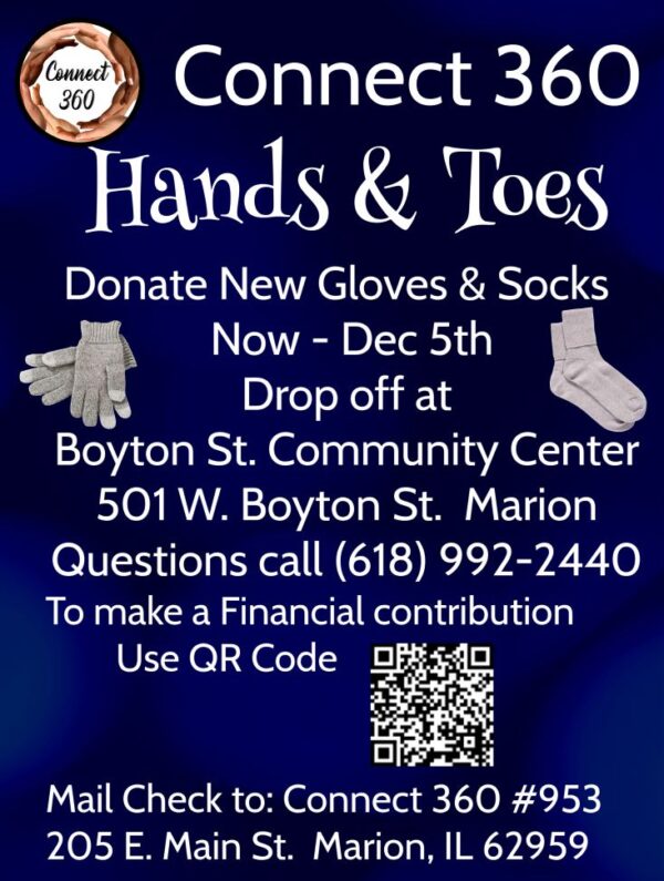Connect 360 Presents its 4th Annual Hands & Toes Event Donation accepted from Nov 1st – Dec 14, 2023 Drop off and pickup location Boyton Street Community Center 501 W. Boyton St, Marion IL Monetary Donations Accepted Make Checks payable to Connect 360 205 E. Main Unit 953 Marion, IL 62959 For more information please […]
